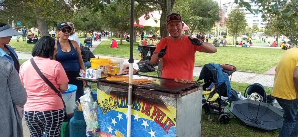 Muy cerca a las canchas de fútbol, al ritmo de un joropo oriental (ritmo tradicional venezolano), encontramos a Felíx, quien lleva 6 años viviendo en Ecuador, él es propietario de un restaurante de Cachapa Venezolana (tortilla de masa de choclo, muy parecida a la masa de la humita, pero más líquida, preparada a la plancha acompañada de queso de mano, idéntico al queso de hoja, natilla, jamón o carne de cerdo, decorado con queso llanero rallado) en centro norte de Quito, en plena esquina de la Juan León Mera y Calama, junto al lugar mítico de la noche bohemia “El No Bar”, los domingos sale con su puesto ambulante a la Carolina, motivado por la gran comunidad local y extranjera, aunque la policía metropolitana juega al gato y al ratón a veces con ellos.